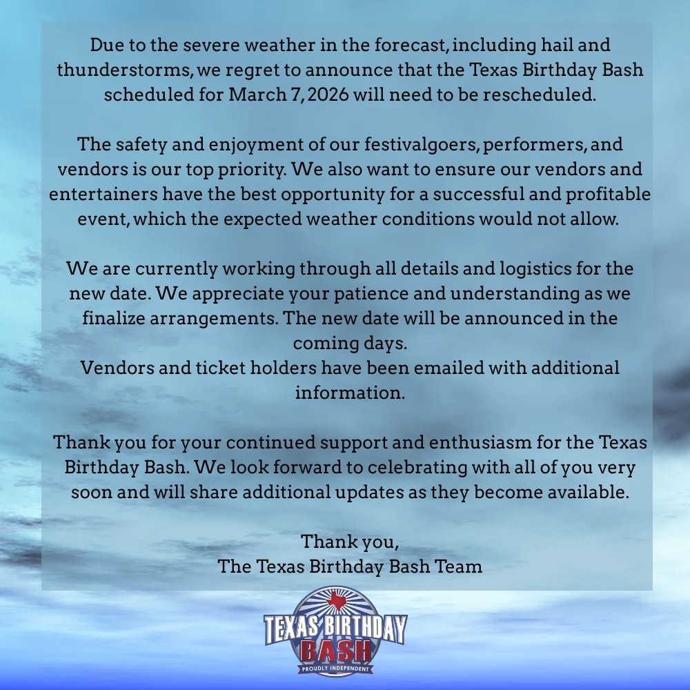 Due to the severe weather in the forecast, including hail and thunderstorms, we regret to announce that the Texas Birthday Bash scheduled for March 7, 2026 will need to be rescheduled.